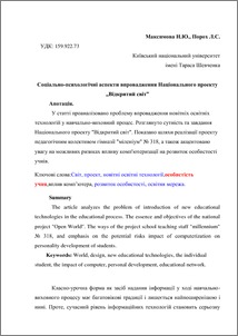 - Максимова, Н.Ю. (2014) Social and psychological aspects of implementation of the national project "Open World" Рідна школа: щомісячний науково-педагогічний журнал, 1/2. pp. 27-30. ISSN 0131-6788