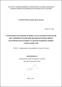 - Алексеев, О.О. (2012) Theoretical and methodical bases of using distance learning technologies for students of machine-building faculties Dissertation candidate2 thesis, Інститут інформаційних технологій і засобів навчання.