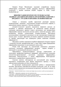 - Бісіркін, П.М. (2014) The use of Web-based resources as a means indyvidualizatsiyiyi training workshops on the subject of "labor training" primary school. In: Матеріали науково-практичніої Інтернет-конференції «Інформаційні технології в навчальному процесі 2014» 12-17 грудня 2014 року. . Чернігівський обласний інститут Післядипломної педагогічної освіти імені К.Д.Ушинського , м.Чернігів, Украина. (In Press)