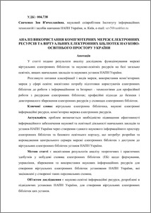 - Савченко, З.В. (2012) Аnalysis of computer networks electronic resources and virtual electronic library of scientific and educational space Ukraine Інформаційні технології і засоби навчання , 5 (31). ISSN 2076-8184