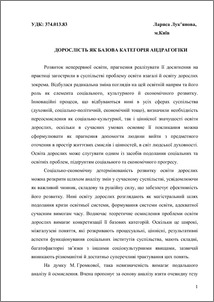 - Лук’янова, Лариса Борисівна (2010) Adultness as base category of andragogics Adult education: theory, experience and prospects (2). pp. 19-27. ISSN ISBN 978-966-221336-2