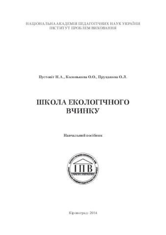 Пустовіт, Наталія Афанасіївна (orcid.org/0000-0003-4731-4632), Колонькова, Олена Олексіївна (orcid.org/0000-0002-4153-2981) and Пруцакова, Ольга Леонідівна (orcid.org/0000-0002-7482-8404) (2014) School of Environmental Action: Educational manual . ТОВ Імекс-ЛТД, м. Кіровоград, Україна.