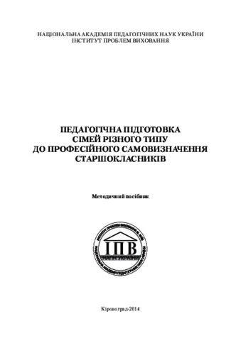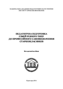 Посібник присвячено розгляду педагогічної підготовки батьків до професійного самовизначення старшокласників, що відображає інноваційний підхід до розв’язання цієї проблеми. Порушені питання розглядаються як у теоретичній, так і в методичній площині: поряд із науковими положеннями щодо сутності особистісного та професійного самовизначення старшокласників, характеристики професійного самовизначення в історичній ретроспективі, ролі сім’ї і впливу батьків на професійне самовизначення дитини старшого шкільного віку подано емпіричні та методичні матеріали (діагностичні методики, зміст і форми просвітницької роботи з батьками, орієнтовна схема системи її організації). Для класних керівників, шкільних психологів, соціальних педагогів, адміністрації загальноосвітніх навчальних закладів. Матеріали посібника також стануть у пригоді викладачам і студентам вищих педагогічних навчальних закладів, аспірантам, які досліджують аналогічні або суміжні до них питання.