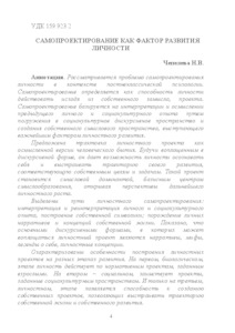 The problem of self designing considered in the context of postnon-classical psychology. Self designing is defined as a way of the personality to act on the basis of their own plan, design. Self-designing is based on the interpretation and understanding of previous personal and socio-cultural experience by immersion in a socio-cultural discursive space and by creation of own sense space as important factor in personal development. Interpretation of the personal design as a meaningful version of human existence is proposed. Being embodied in the discursive form, it rsonality awareness and builds the trajectory of its development corresponding to own aims and objectives. Such design becomes a sense dominant, basic centre of meaning creating that opens prospects for further personal growth. The ways of personal designing are identified: interpretation and reinterpretation of personal and socio-cultural experience, own symbols building; generation of personal narratives and of conception of human life. It is shown that the main discursive forms, which may implement personal design, are narratives, myths, legends about yourself, personal conception. The features of the construction of personal design at various stages of development are characterized. At the first, biological, stage personality acts on regulatory design, specified by adults. On the second – the social, design are given by sociocultural space. And on the third, personal, stage there is an ability to create specific designs to build the trajectory of his own life and own development.