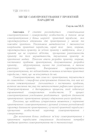 - Смульсон, Марина Лазарівна (2014) Місце самопроектування в проектній парадигмі Актуальні проблеми психології: збірник наукових праць Інституту психології імені Г.С. Костюка НАПН України. Психологічна герменевтика, 8 (2). pp. 16-29. ISSN 2072 –4772
