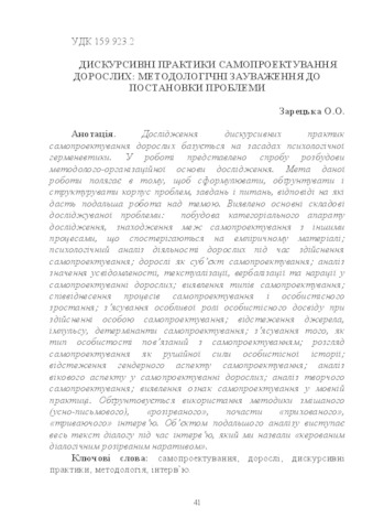 - Зарецька, О.О. (2014) Discursive Practices Of Adult Self- Designing: Methodological Notes Of The Problem Актуальні проблеми психології, 8 (2). pp. 41-52. ISSN 2072 –4772