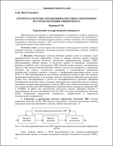 Представлены результаты по проектированию и разработке системы управления качеством электронных информационных ресурсов и ее использованию для организации и проведения мониторинга качества ресурсов высшего учебного заведения. Как иллюстрация мониторинга качества ресурсов в ХГУ используется система дистанционного обучения «Херсонский виртуальный университет».