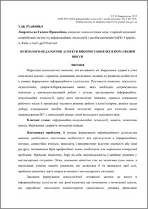 Outlined psychological factors that affect the health of primary school student and help avoid adverse effects on personality development in terms of information society. We consider the complex psychological and educational, zdorov'yazberezhuvalnyh requirements to be followed teachers in educational work with children, applying information and communication technologies, including ergonomic factors, workplace rules and equipment of the time mode of computer requirements selection of funds. Provided teaching tips for teachers to implement ICT in the learning process of elementary school children.