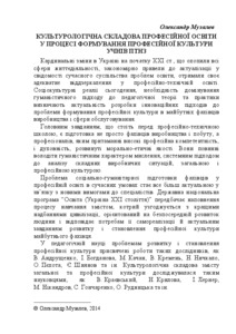 - Музальов, О.О. (2014) Культурологічна складова професійної освіти у процесі формування професійної культури учнів ПТНЗ Педагогіка і психологія професійної освіти (4). pp. 9-19. ISSN 2218-5186