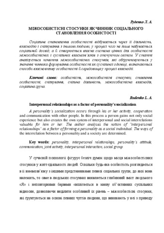 - Руденко, Л.А. (2014) Міжособистісні стосунки як чинник соціального становлення особистості Наукові записки Українського католицького університету, 1 (IV). pp. 198-207.
