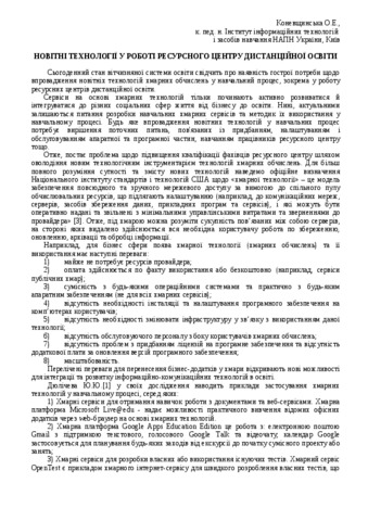 Cервіси на основі хмарних технологій тільки починають активно розвиватися й інтегруватися до різних соціальних сфер життя від бізнесу до освіти. Нині, актуальними залишаються питання розробки навчальних хмарних сервісів та методик їх використання у навчальному процесі. Будь яке впровадження новітних технологій у навчальних процес потребує вирішення поточних питань, пов'язаних із придбанням, налаштуванням і обслуговуванням апаратної та програмної частин, навчанням працівників ресурсного центру