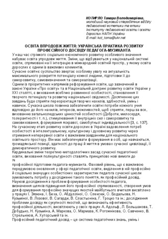 - Котирло, Т.В. (orcid.org/0000-0002-3256-5749) (2014) Освіта впродовж життя: українська практика розвитку професійного досвіду педагога-музиканта In: Освіта впродовж життя: вимоги часу: матеріали VІ Всеукраїнських педагогічних читань до 95-річчя від дня народження видатного вченого-педагога Олени Степанівни Дубинчук (6). ПП Лисенко М.М, м. Ніжин, Україна, pp. 75-77.