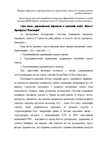 - Іванюк, І.В. (orcid.org/0000-0003-2381-785X) and Паращенко, Л.І. (2014) Three whales management vertical in school education. Quality? Transparency? Interaction? Освітня політика. Портал громадських експертів.