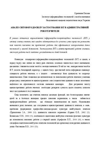 - Кравчина, О.Є. (2014) Аналіз світового досвіду застосування ІКТ в адміністративній роботі вчителя Інформатика.