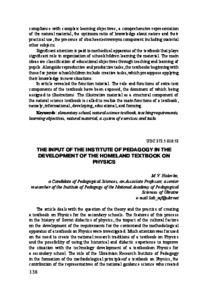 The article deals with the question of the theory and the practice of creating a textbook on Physics for the secondary schools. The features of this process in the history of Soviet didactics of physics, the impact of the cultural factors on the development of the requirements for the contentand the methodological apparatus of a textbook on Physics were investigated. Much attention was focused on the need to create the national research traditions of a textbook on Physics and the possibility of using the historical and didactic experience to improve the situation with the technology development of a textbookon Physics for a secondary school. The role of the Ukrainian Research Institute of Pedagogy in the formation of the methodological principlesof a textbook on Physics, the contribution of the representatives of the national guidance science who created the original methodology of Physics teaching at school were justifi ed. The value of the modern researchers at the Institute of Pedagogy in the development of the textbooks on Physics as a means of displaying the content of school education, one of the mechanisms of the State Standard of the full secondary education was demonstrated. The systematic process of creating homeland textbooks on Physics and the weighty contribution of the Institute of Pedagogy at various stages of the development of school physics education and pedagogy was justifi ed.