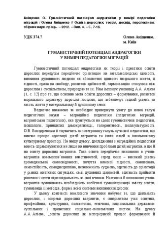 - Аніщенко, Олена Валеріївна (orcid.org/0000-0002-6145-2321) (2012) Humanitarian potential of andragogy in the context Освіта дорослих: теорія, досвід, перспективи, 4. pp. 7-16. ISSN ISBN 978-966-2153-53-8
