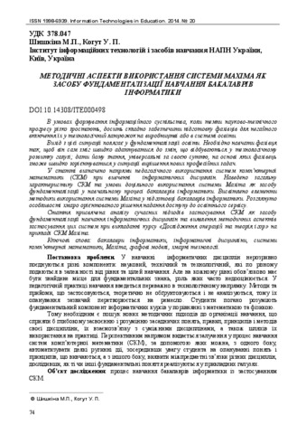 - Шишкіна, М.П. and Когут, У.П. (2014) The methodical aspects of MAXIMA using as a tool for fundamental training of the bachelors of computer science Information Technologies in Education (20). pp. 74-83.