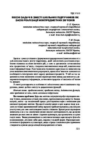 - Кравчук, Ольга Павлівна and Хмара, Тамара Миколаївна (2014) The quality problems as a means of realizations the interdisciplinary connections in content of school textbooks Проблеми сучасного підручника (14). pp. 321-329. ISSN ISBN 978-966-644-382-6