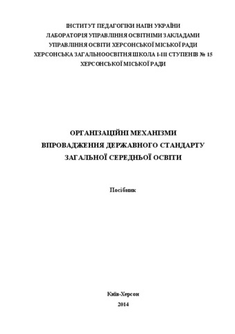 Островерхова, Н.М., Калініна, Л.М. (orcid.org/0000-0003-0534-6089) and Стратійчук, Л.Л. (2014) Організаційні механізми впровадження Державного стандарту загальної середньої освіти . Інститут педагогіки, м. Київ, м. Херсон, Україна.