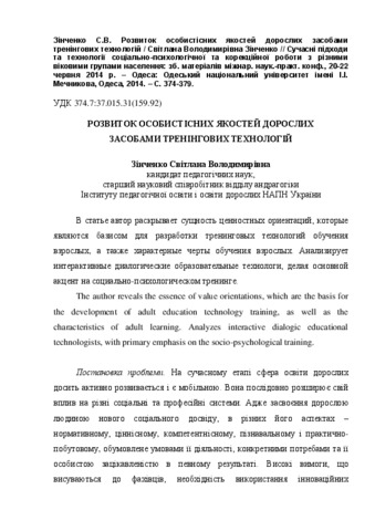 - Зінченко, Світлана Володимирівна (2014) The development of personal qualities of adult training facilities technology In: Сучасні підходи та технології соціально-психологічної та корекційної роботи з різними віковими групами населення: зб. матеріалів міжнар. наук.-практ. конф. 20-22 червня 2014 р . Одеський національний університет імені І.І. Мечникова, м.Одеса, Україна, pp. 374-379.
