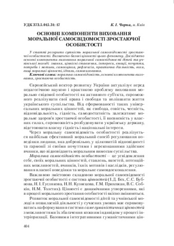- Чорна, К.І. (2014) The Main Components of Moral Self-Consciousness of Personality Теоретико-методичні проблеми виховання дітей та учнівської молоді, 2 (18). pp. 404-412. ISSN 978-966-189-209-4
