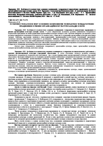 - Терещенко, К.В. (2014) Distinctive features of relationship between the main components of educationists’ tolerance and levels of organizational culture of educational institutions Актуальні проблеми психології: зб. наукових праць Інституту психології імені Г.С. Костюка НАПН України. – Т. І : Організаційна психологія. Економічна психологія. Соціальна психологія (41). pp. 56-60. ISSN 2072-4772