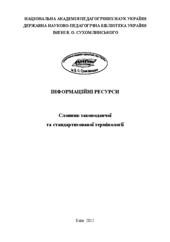 Зозуля, Світлана Миколаївна (orcid.org/0000-0003-3350-4638), Рогова, Павла Іванівна, Лобановська, Інна Георгіївна (orcid.org/0000-0002-7379-197X) and Чепуренко, Я.О. (orcid.org/0000-0001-5139-4343) (2012) Інформаційні ресурси. Словник законодавчої та стандартизованої термінології . ТОВ Нілан-ЛТД, м. Вінниця, Україна.
