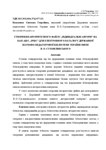 The article deals with the question concerning the creation of authoritative files for V.O. Sukhomlynskyi State Scientific and Pedagogical Library of Ukraine e-catalogue; the notion “authoritative control” is specified; the technology of creation of authoritative file “Individual authors” is shown.
