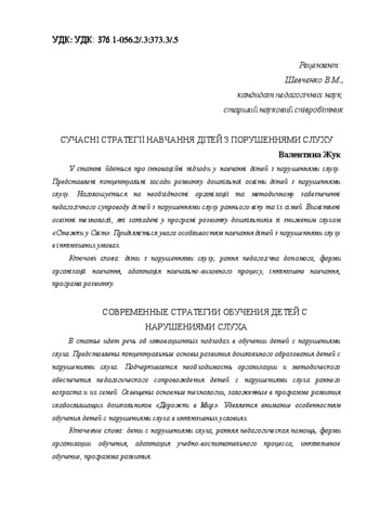 - Жук, В.В. (orcid.org/0000-0001-8183-5250) (2013) Modern strategies of teaching children with hearing impairment A child with sensory disorders: development, training, education (4). pp. 127-133. ISSN 978-966-189-233-9
