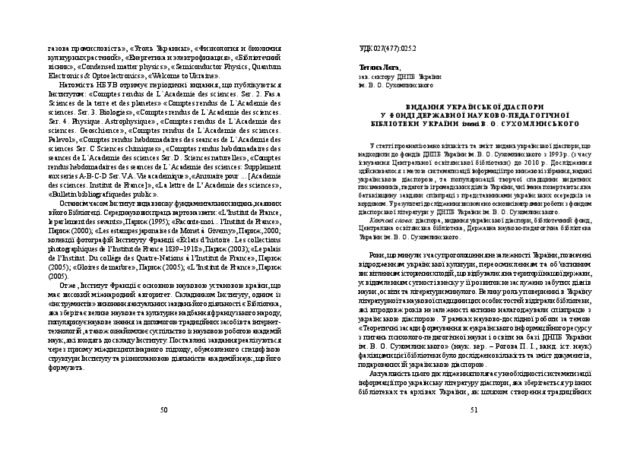 - Лога, Тетяна Володимирівна (2011) Publication of the Ukrainian diaspora in the fund of V. Sukhomlynskyi State Scientific and Pedagogical Library of Ukraine Наукові праці Національної бібліотеки України імені В. І. Вернадського (31). pp. 51-62. ISSN 2224-9516