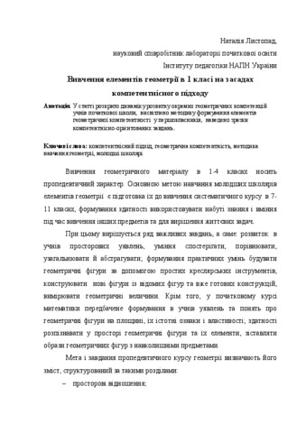 - Листопад, Наталія Петрівна (orcid.org/0000-0002-2922-8450) (2012) The Study of the Elements of Geometry in the First Grade by the means of Competency-based Learning Початкова школа, 11 (521). pp. 4-9. ISSN 0131-5358