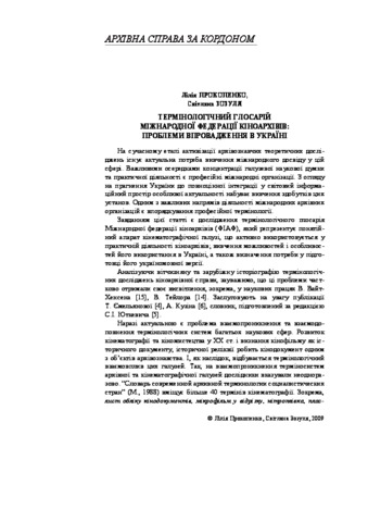 - Зозуля, Світлана Миколаївна (orcid.org/0000-0003-3350-4638) and Прокопенко, Л.С. (2009) Terminological glossary of the i nternational Federation of Film a rchives: problems of adoption in Ukraine Архіви України (5). pp. 186-192. ISSN 0320-9466