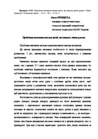 - Прищепа, О.Ю. (2010) Problems of teaching writing children writing with his left hand Початкова школа, 5 (420). pp. 10-13. ISSN 0131-5358