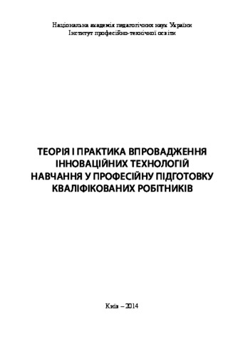 У монографії здійснено теоретичний аналіз проблеми впровадження інноваційних технологій навчання у професійно-технічну освіту. Представлено теоретико-методологічне обґрунтування інноваційних технологій навчання, проаналізовано сучасну практику впровадження означених технологій навчання у професійну підготовку кваліфікованих робітників. Визначено та охарактеризовано методичні засади застосування інноваційних технологій у професійно-технічній освіті, зокрема таких технологій: навчального проектування, проблемно-розвивального навчання, валідного тестового контролю. Обгрунтовано особливості проектування та реалізації особистісно-розвивальних навчальних технологій. Охарактеризовано формування готовності майбутніх педагогів до впровадження інноваційних технологій навчання. Для педагогічних працівників середніх загальноосвітніх та професійно-технічних навчальних закладів, працівників науково-методичних центрів (кабінетів) професійно-технічної освіти МОН України, викладачів і студентів вищих навчальних закладів, науковців, аспірантів та докторантів.