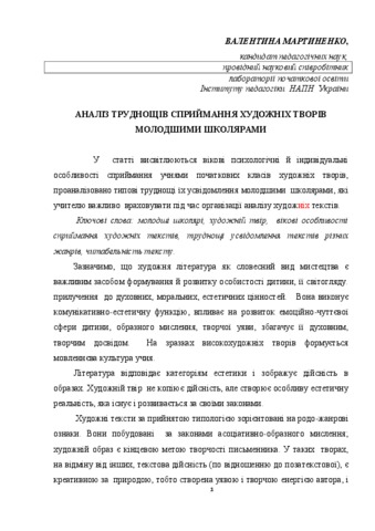 - Мартиненко, Валентина Олександрівна (orcid.org/0000-0001-6317-3492) (2012) The analysis of difficuilties for apprehension of fictions by younger pupils Українська мова і література в школі (6). pp. 16 -20.