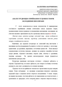 У статті висвітлюються вікові психологічні й індивідуальні особливості сприймання учнями початкових класів художніх творів, проаналізовано типові труднощі їх усвідомлення молодшими школярами, які учителю важливо враховувати під час організації аналізу художніх текстів. В статье освещаються возрастные психологические, а также индивидуальные особенности восприятия учащимися начальних классов художественных произведений, проанализованы типичные трудности их понимания школьниками, которые учителю важно учитывать в процессе организации анализа художественных текстов. In the article, the age psychological and individual peculiarities of the primary pupils' perception of fictional texts are demonstrated; the typical difficulties inheir comprehension which are important to be taken intpo consideration by the teachers during the organization of the fictional texts analysis were studied. Keywords: junior schoolchildren, fictional text, age peculiarities of the fictional texts