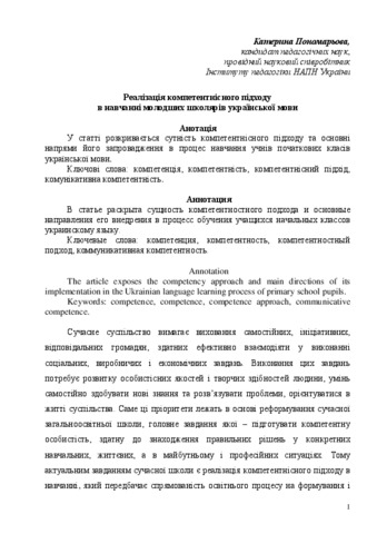 - Пономарьова, К. І. (2010) Implementation of competence-based approach in teaching Ukrainian language to primary school children Початкова школа (12). pp. 49-52. ISSN 0131-5358