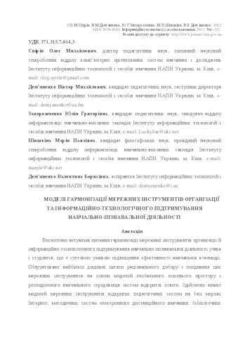 - Спірін, О.М. (orcid.org/0000-0002-9594-6602), Дем’яненко, В.М. (orcid.org/0000-0002-1469-8185), Запорожченко, Ю.Г., Шишкіна, М.П. and Дем’яненко, В.Б. (orcid.org/0000-0002-8040-5432) (2012) Models of Harmonizing of Network Tools of Organization and Information Technological Support of Learning and Cognitive Activity Information Technologies and Learning Tools, 6 (32).