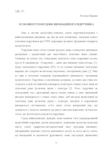 - Ростока, Марина Львівна (2012) Features of the Сonstruction of an Innovative Тextbook In: Децентралізація управління професійно-технічною освітою: теорія і практика, 17 травня 2012 року, м. Київ, Україна.