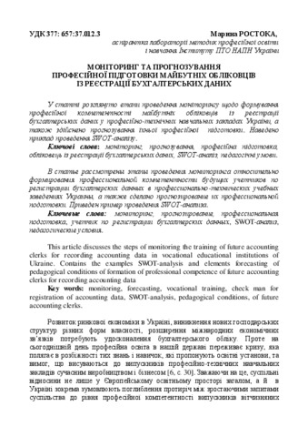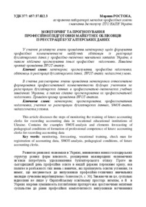 - Ростока, Марина Львівна (2014) Monitoring and forecasting Professional training formation of professional competence of future accounting clerks for recording accounting data Нова педагогічна думка, 3 (79). pp. 193-197.