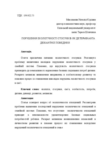 - Масимова, Н.Ю. (2014) Violation of environmental relations as determinants of deviant behavior Актуальні проблеми психології: зб. наук. праць Інституту психології імені Г.С. Костюка НАПН України, 7 (36). pp. 262-270. ISSN 2072-4772