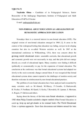 - Василенко, Олена Вікторівна (2014) Non-formal adult education as a realisation of humanistic approach in education Adult education: theory, experience and perspectives, 1 (8). pp. 172-181. ISSN 2308-6386