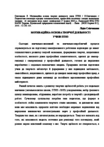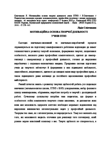 - Сліпчишин, Л.В. (2010) Motivational basis of students’ creative activity in vocational school Педагогічна взаємодія середніх загальноосвітніх, професійно-технічних і вищих навчальних закладів. pp. 158-165.