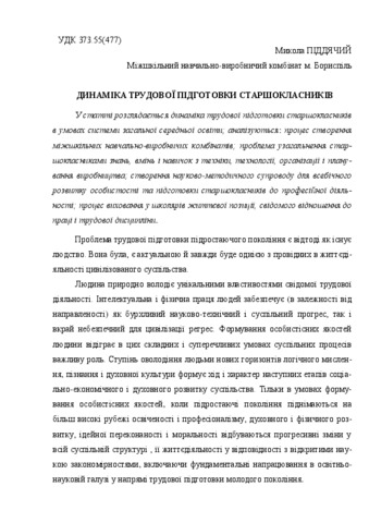 У статті розглядається динаміка трудової підготовки старшокласників в умовах системи загальної середньої освіти; аналізуються: процес створення міжшкільних навчально-виробничих комбінатів; проблема узагальнення старшокласниками знань, вмінь і навичок з техніки, технології, організації і планування виробництва; створення науково-методичного супроводу для всебічного розвитку особистості та підготовки старшокласників до професійної діяльності; процес виховання у школярів життєвої позиції, свідомого відношення до праці і трудової дисципліни.
