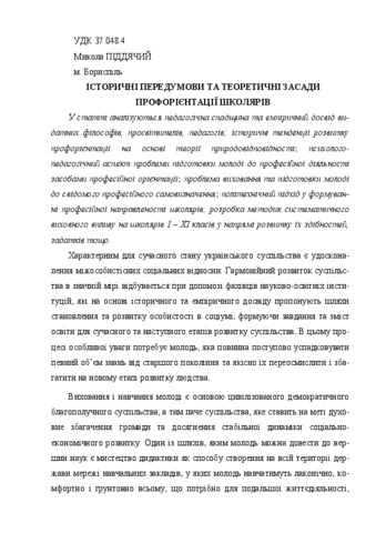 - Піддячий, Микола Іванович (orcid.org/0000-0001-6571-1450) (2006) Історичні передумови та теоретичні засади профорієнтації школярів Педагогіка і психологія, 3 (52). pp. 29-36. ISSN 2304-0629