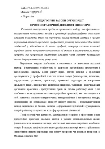 - Піддячий, Микола Іванович (orcid.org/0000-0001-6571-1450) (2007) Педагогічні засоби організації професіографічної діяльності школярів Наукові записки Тернопільського національного педагогічного університету імені Володимира Гнатюка (2). pp. 3-9. ISSN 2078-2357