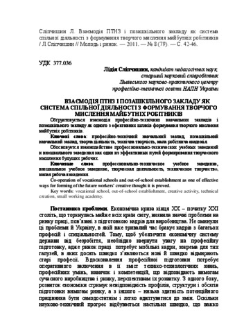- Сліпчишин, Л.В. (2011) Interaction of vocational schools and nonschool establishment as a system of joint activity with the formation of creative thinking of future workers Молодь і ринок, 8 (79). pp. 42-46.
