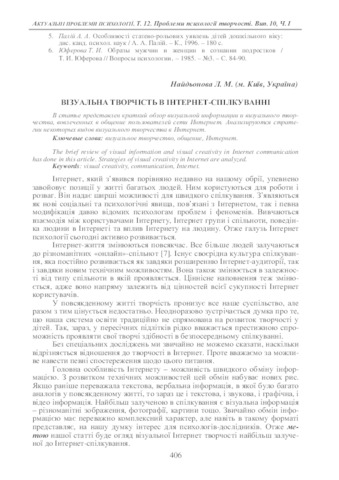 - Найдьонова, Л.М. (2010) Visual Creativity in Internet Communication Актуальні проблеми психології: Психологія творчості, 12 (10). pp. 406-413. ISSN ISSN 2072-4772