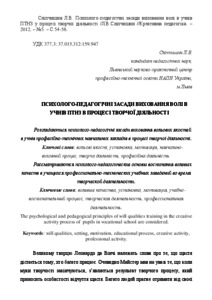 - Сліпчишин, Л.В. (2012) The psychological and pedagogical principles of will qualities training to the creative activity process in vocational school's pupils Креативна педагогіка (5). pp. 54-58.