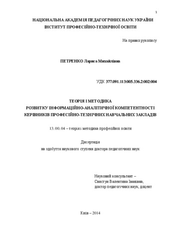 Thesis for a Doctoral Degree in Pedagogics in speciality 13.00.04 – theory and methodology of professional education. – Institute of Vocational Education of the National Academy of Pedagogical Sciences of Ukraine, Kyiv, 2014. The thesis has examined and grounded the development of information and analytical competence by the heads of vocational schools as a system that reflects the dynamics of this process through realisation of its components: of concept, organization and performance. The methodology of information and analytical competence development of vocational school heads has been presented. It comprises module-based syllabus; traditional and innovative methods and technologies, the study guide «Information and Analytical Competence of Vocational Schools Heads: Algorithm of Efficiency» and the author’s blog «Vocational School Manager».
